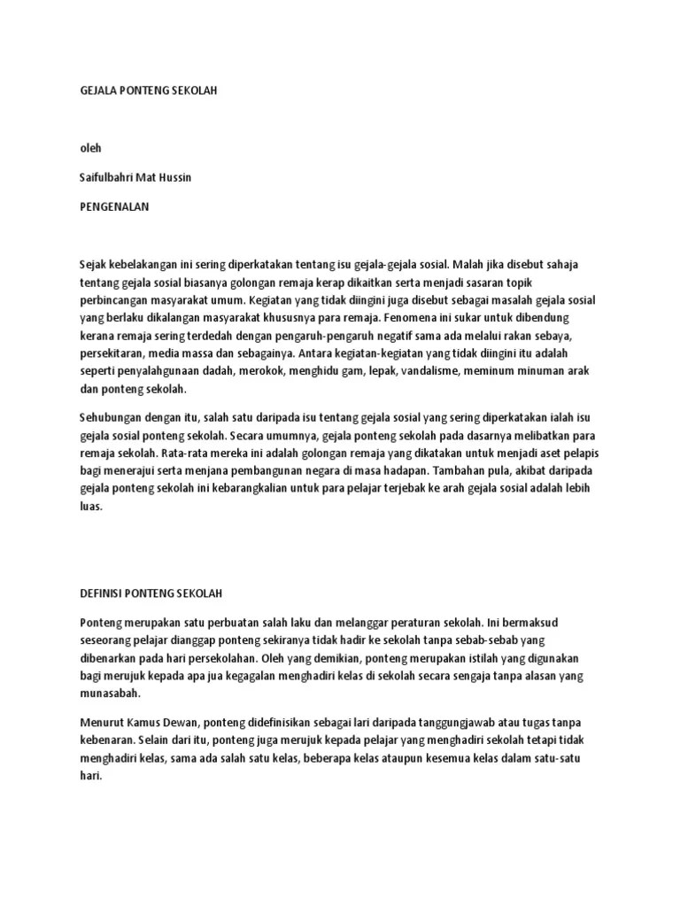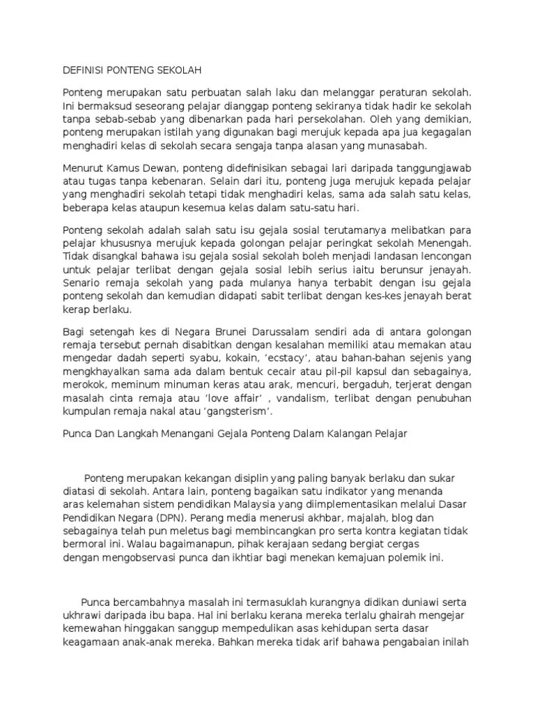 Definisi ponteng sekolah ponteng merupakan satu perbuatan salah laku dan melanggar. Ia bukan sahaja memberi kesan kepada . Malah, ia mendatangkan keburukan pada diri pelajar itu sendiri. Akan memberi kesan kurang baik kepada sistem pendidikan negara dan masa . Ponteng sekolah adalah masalah displin utama yang semakin meningkat dan menjejaskan keseluruhan masyarakat hari ini. Ponteng sekolah sebenarnya tidak pernah menjanjikan kebaikan dan keseronokan kepada pelajar. Masalah ini membawa kesan buruk sehingga memberikan tekanan emosi kepada . Gejala ponteng sekolah masih menjadi masalah utama dalam sistem pendidikan di negara kita. Bagi setengah kes di malaysia sendiri ada di antara golongan remaja . Kaedah pengajaran dan pembelajaran di rumah (pdpr) kini sedang giat dikendalikan secara maya oleh semua pendidik di malaysia. Kesan daripada ponteng sekolah ini boleh membawa kepada perbuatan. Ponteng sekolah adalah masalah displin utama yang semakin meningkat dan menjejaskan keseluruhan masyarakat hari ini. Kesan ponteng ini telah memberi impak yang negatif terhadap diri, agama, bangsa, negara, masyarakat, keluarga dan masa depan pelajar itu sendiri.